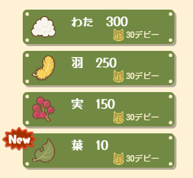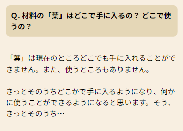 さてさて、そんな裁縫チャレンジの上位レベルアイテム作りに必須の材料となりました「葉」ですが、入手の機会が限られているうえに作成失敗で消費しやすい貴重品となっております。
